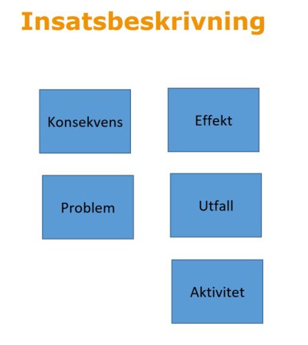 Med hjälp av modellen nedan lämnar du in en beskrivning till kansliet där du berättar: vilket problem du har identifierat, vilka konsekvenser problemet har, vilka effekter du vill uppnå med insatsen, vilka resultat insatsen förväntas ge och vilka aktiviteter du planerar för att nå dessa effekter.
